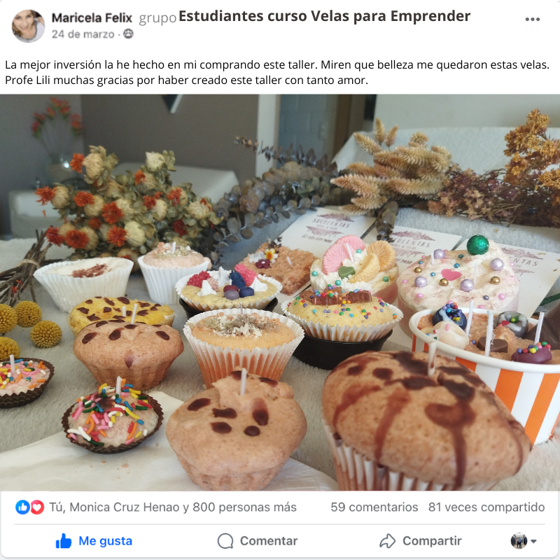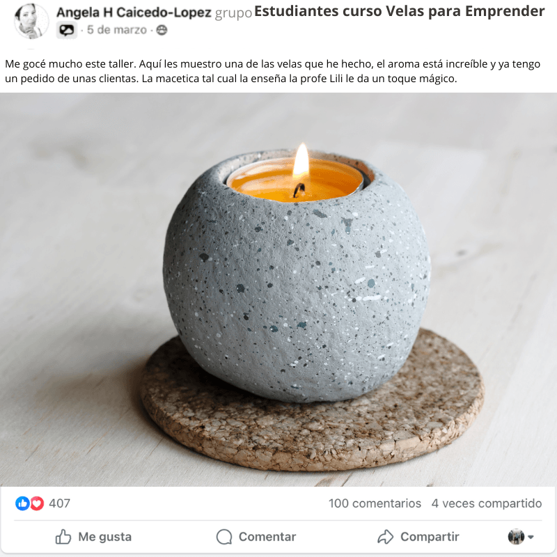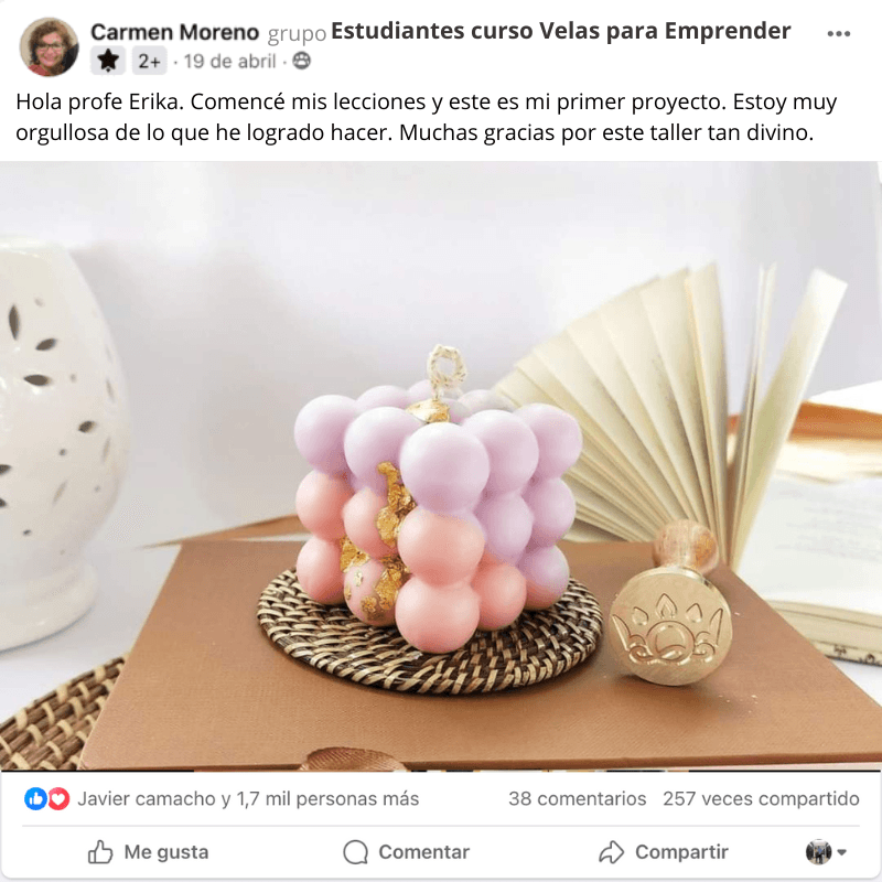 El curso es hermoso y las clases son muy claras. La plataforma me funcionó perfecto y aprendí a hacer mis velas rápidamente porque la profesora explica con muchísima paciencia. Gracias a Dios ya tengo mis primeros pedidos y poco a poco mi emprendimiento va creciendo. Sin duda, este curso está hecho con mucho amor.