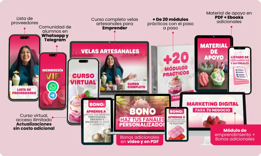 ¡Haz tu compra hoy y recibe acceso inmediato a +430 recetas paso a paso para crear velas únicas desde casa! Además, desbloquea nuestro exclusivo curso en video y empieza a transformar tu pasión en un verdadero arte. ¡No dejes pasar esta oportunidad!